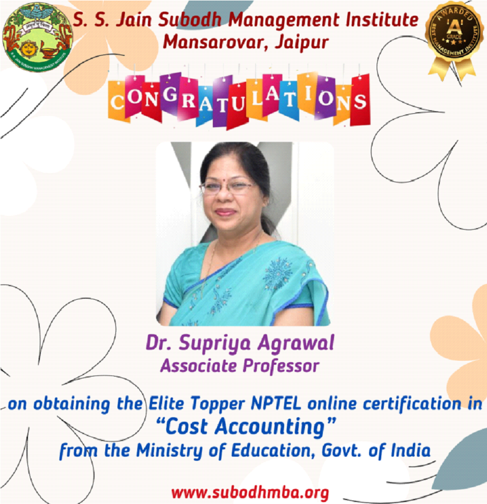 FCMA (Dr.) Supriya Agrawal, Associate Professor, achieved the Gold Medal for being the topper of NPTEL Finance course of Cost Accounting among more than lakh academicians of the nation by the Ministry of Education, Government of India.