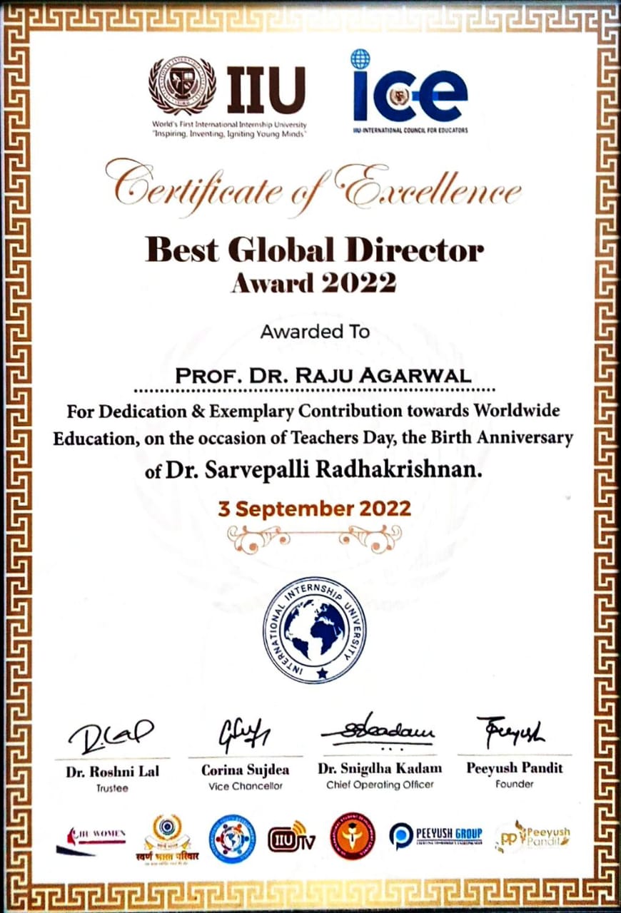 Prof. (Dr.) Raju Agrawal got Best Global Director Award 2022 for dedication &  exemplary contribution towards worldwide education, on the occasion of Teachers  Day, the birth of Dr. Sarvepalli Radhakrishnan.