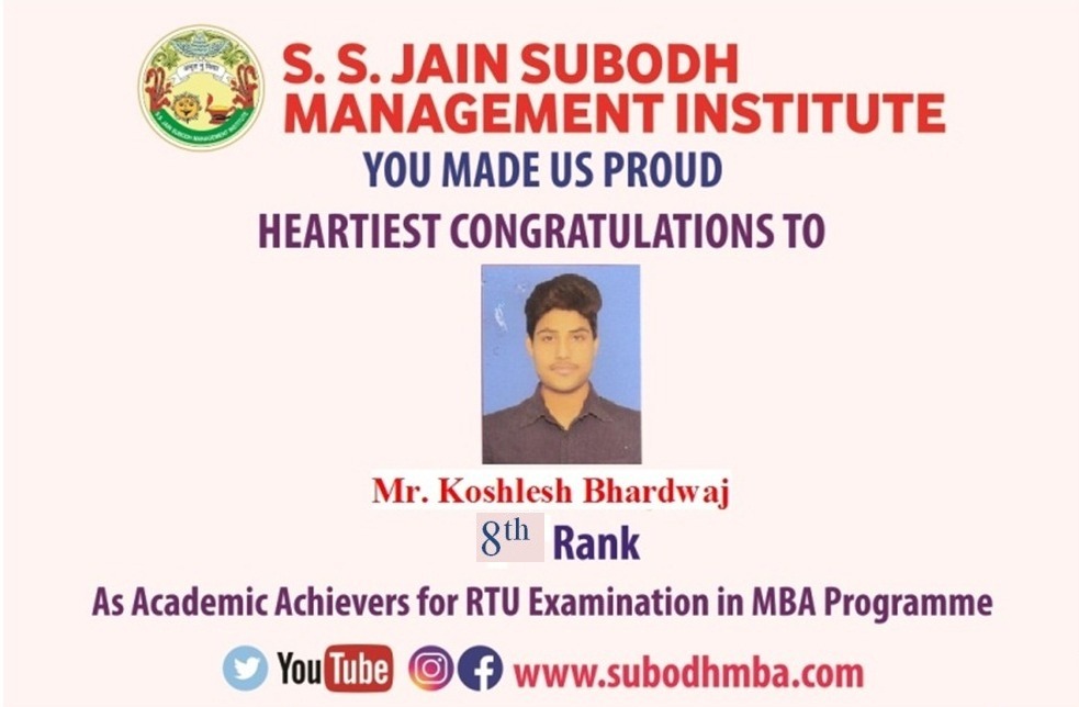 Mr. Koshlesh Bhardwaj secured 8th Rank in Merit list of MBA programme of RTU Kota