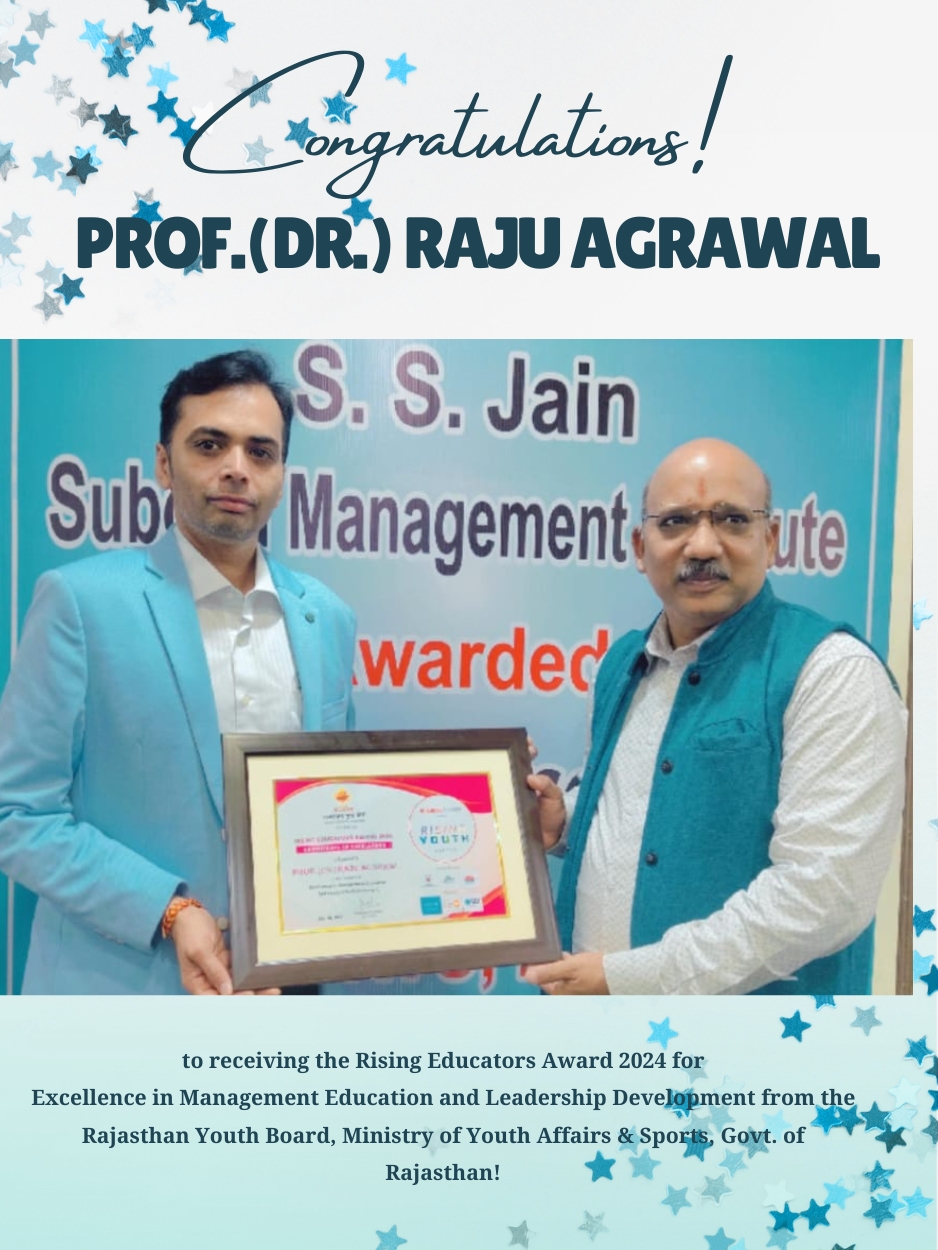 We are delighted to announce that Prof. (Dr.) Raju Agrawal has received the esteemed Rising Educators Award 2024 for his outstanding contributions to Management Education and Leadership Development. This prestigious recognition, presented by the Rajasthan Youth Board, Ministry of Youth Affairs & Sports, Govt. of Rajasthan, celebrates his dedication to fostering innovation and excellence in these fields.