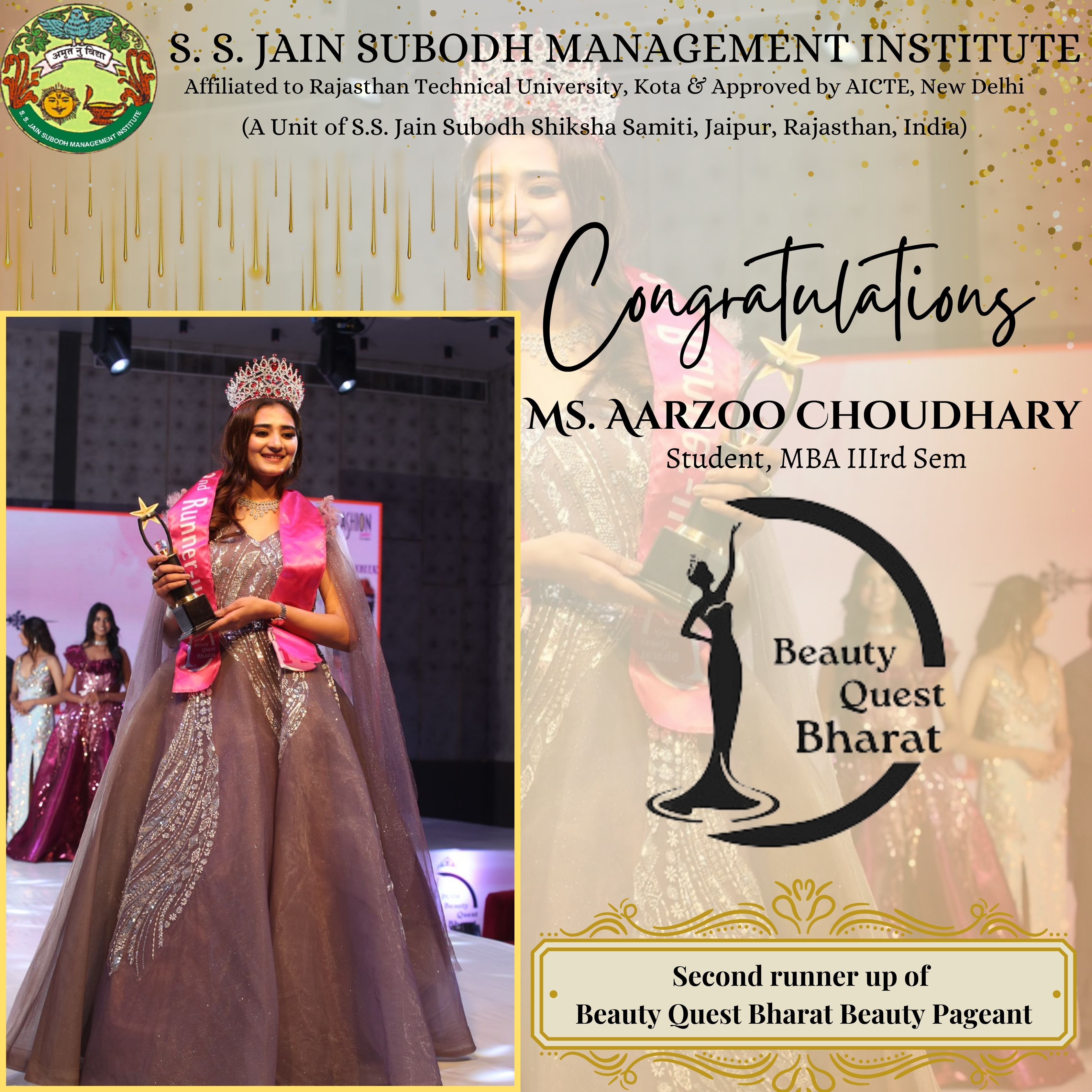 Congratulations to Ms. Aarjoo, a student of MBA IIIrd Semester, for achieving the prestigious title of Second Runner-Up in the Beauty Quest Bharat Beauty Pageant!