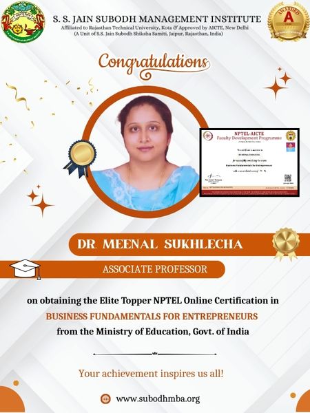 Dr. Meenal Sukhlecha, Associate Professor, achieved the Gold Medal for being the topper of NPTEL Certification in Business Fundamentals for Entrepreneurs among more than lakh academicians of the nation by the Ministry of Education, Government of India.