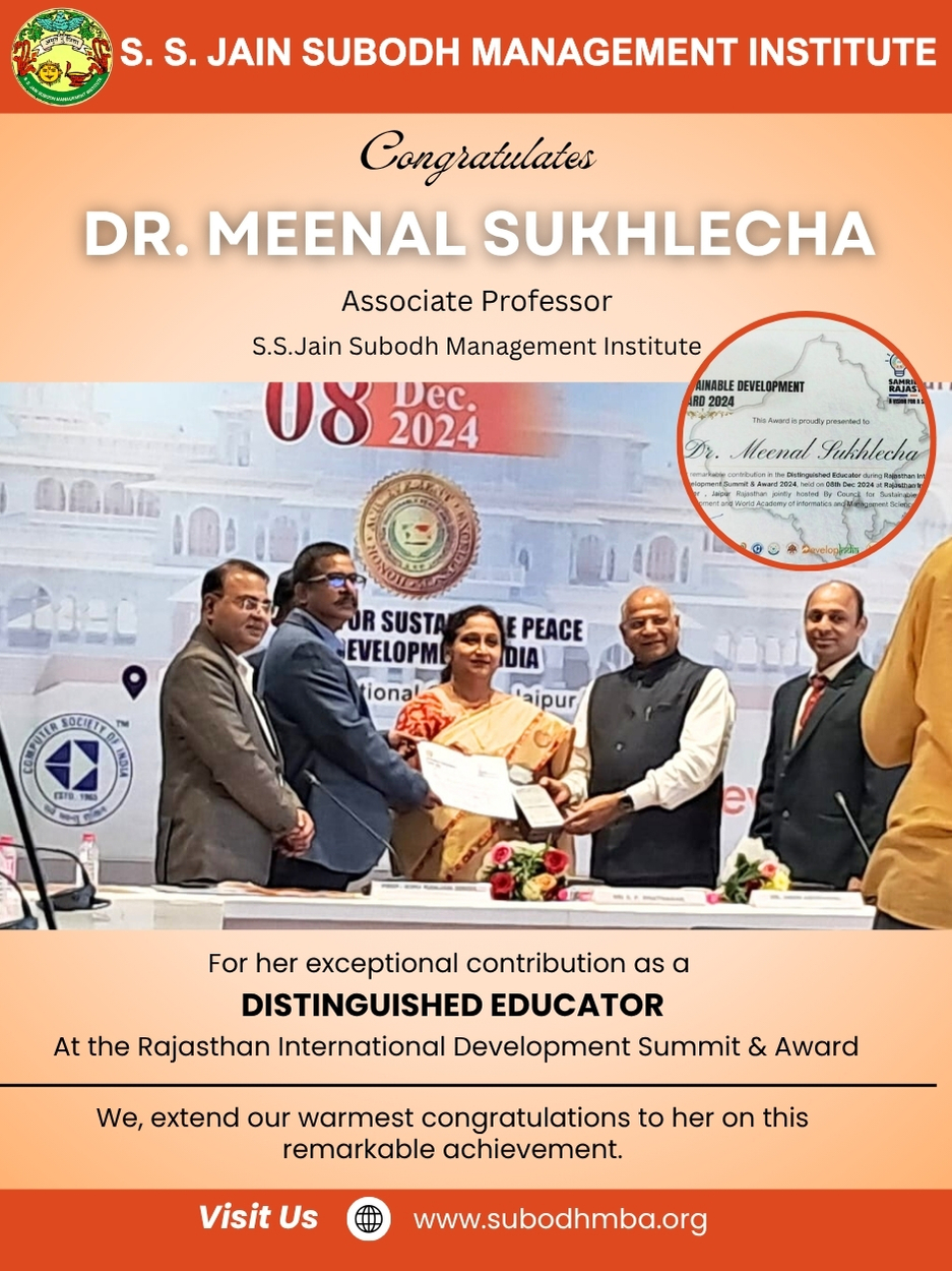 S.S. Jain Subodh Management Institute proudly congratulates Dr. Meenal Sukhlecha for receiving the Distinguished Educator Award at the Rajasthan International Development Summit & Award. Her outstanding contribution to education continues to inspire future leaders. We are proud to have such excellence among us.