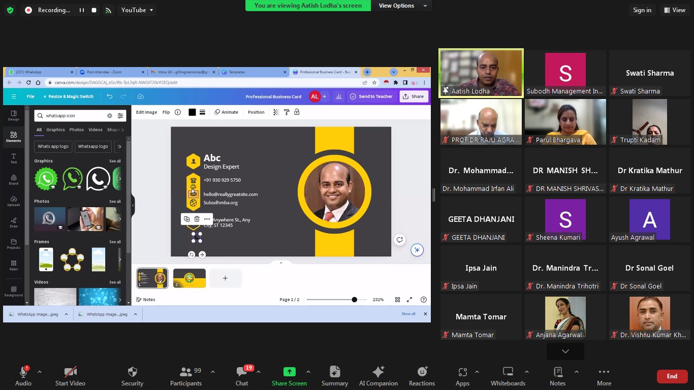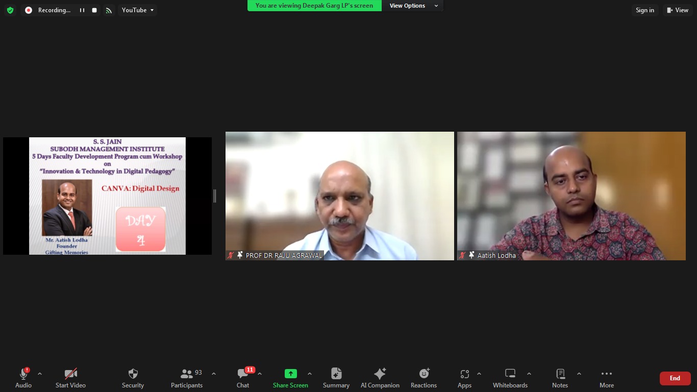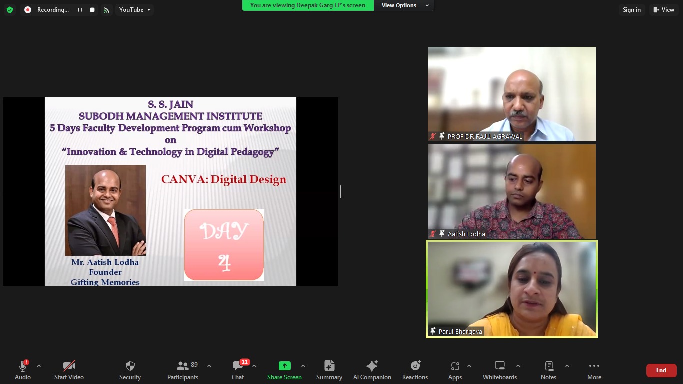 S. S. Jain Subodh Management Institute organized 5 Days Faculty Development Program cum Workshop on “Innovation & Technology in Digital Pedagogy” from 20th-24th May 2024. On day fourth, Mr. Aatish Lodha (Founder of Gifting Memories) was the keynote speaker and delivered a session on which he focused on giving enrichment knowledge of Canva. He introduced the session with a brief knowledge to @Canva: DIGITAL DESIGN One of the most powerful uses of Canva for Education is Lesson Plan creation. Whether you’re brainstorming teaching ideas, outlining a lesson plan, composing instructional text, creating lecture slides, designing visual aids, or simply experimenting with different ways to present concepts—Canva makes it easy to visualize and create effective lessons. Students can use Canva to design and create their own learning portfolios to better visualize and record their learning.