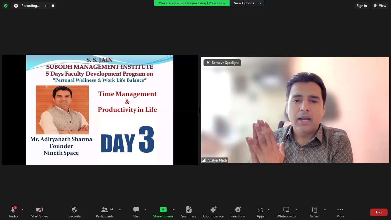 S. S. Jain Subodh Management Institute organized 5 Days Faculty Development Program cum Workshop on “Personal Wellness and Work Life Balance” from 13th-17th May 2024. On day third, Mr. Adityanath Sharma (Entrepreneur) was the keynote speaker and delivered a session on “Time Management and Productivity in Life.”